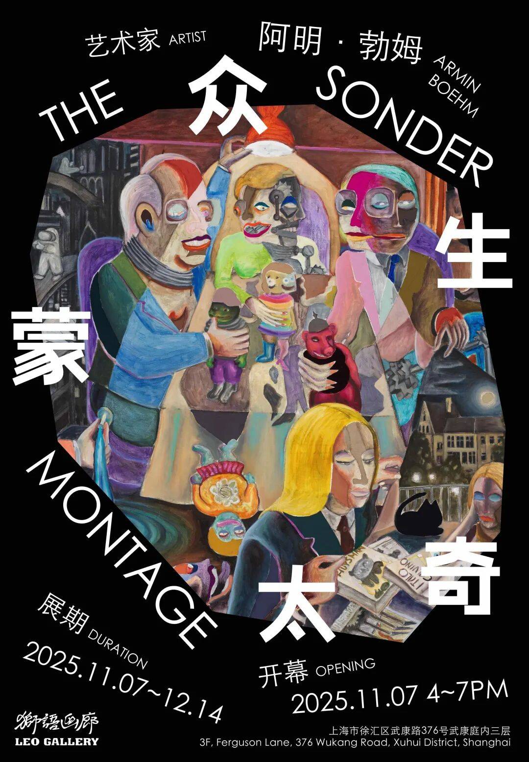 狮语画廊呈现德国艺术家阿明·勃姆个展“众生蒙太奇”。展览集结艺术家十六年创作脉络,从早期板上油画到近年大型布面拼贴,通过混合媒介构建个体与群体交织的叙事现场。作品《门相似,房间各异》以多扇门隐喻平行人生,诠释“每个陌生人都有同样复杂的生命史诗”这一核心概念。