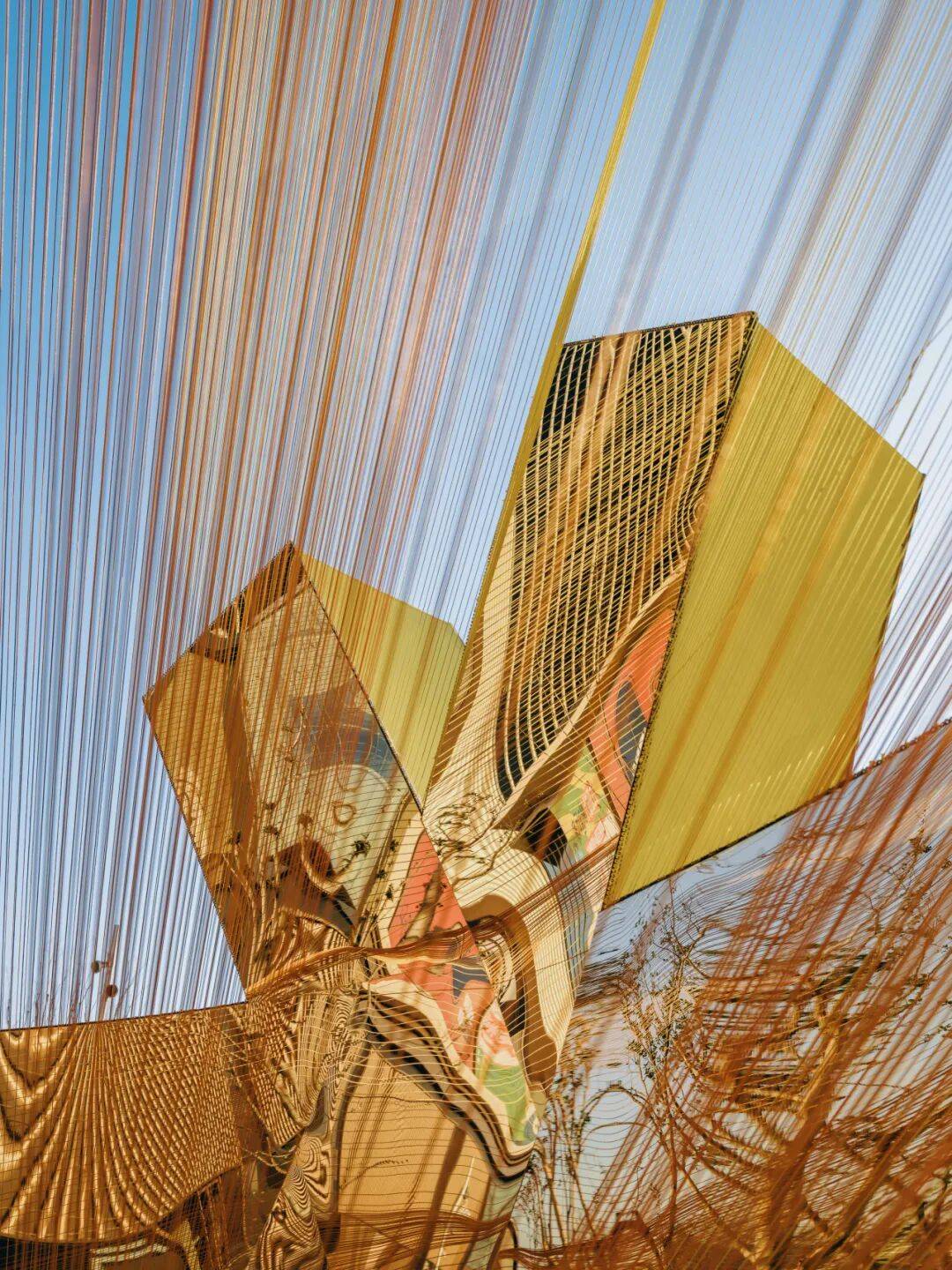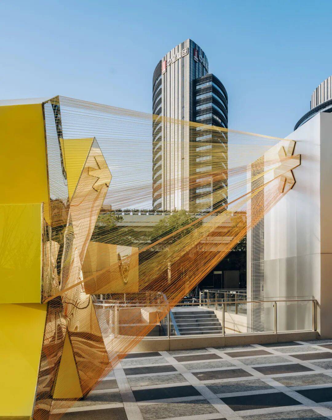六角金星以弯曲的金色镜面不锈钢构成动态星形雕塑。条形六角结构两侧分别呈现外凸放大与内凹缩小的变形视觉效果,黄色亚克力侧边在夜间散发温暖光芒。入口广场装置通过渐变拉线与电梯筒外墙的小金星相连,形成透明渐变体。弯曲镜面折射环境与行人变形影像,拉线区域更成为儿童嬉戏空间,以轻介入方式激活场地活力,创造充满趣味的城市互动体验。