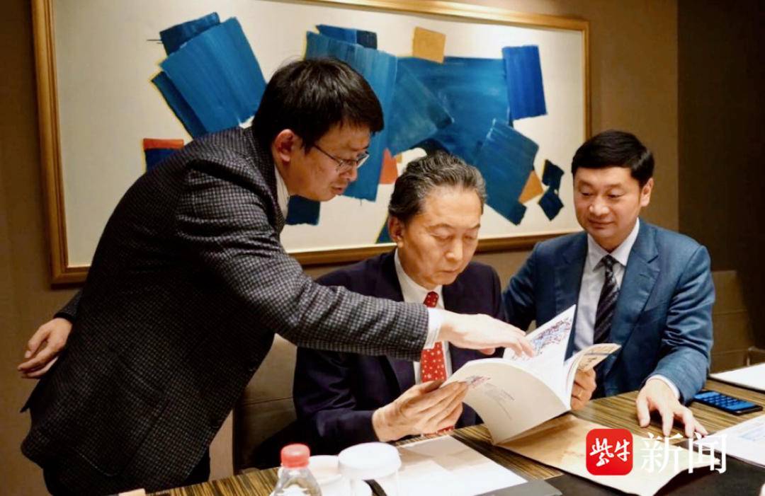 鸠山由纪夫(左)与李俊及其紫藤画合影