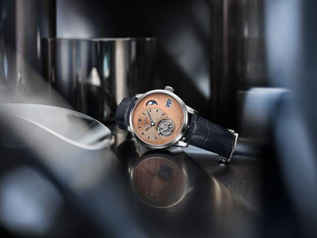 作为格拉苏蒂地区唯一拥有独立表盘工坊的制表品牌,格拉苏蒂原创将世代相传的工艺智慧融于这枚偏心月相陀飞轮腕表之中。表盘独特的铁矿石色泽经过复杂精密电镀工序锻造,其独特的晶体结构让色彩随着光线流转而变幻,宛若晨曦中的矿石般熠熠生辉。左侧的偏心时分显示区饰以精密的唱片纹雕饰,在整体布局中形成绝妙的视觉焦点,尽显德系制表的严谨美学。