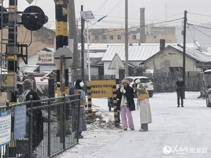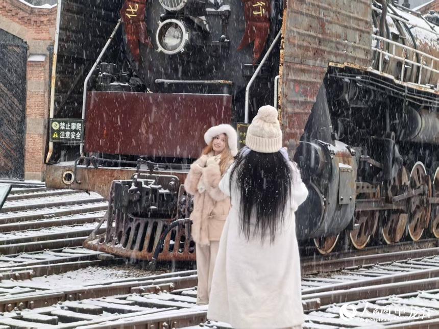 雪幕中,一群身着鲜艳衣服的游客兴奋地举起手机,在小镇各处打卡留念。有人在覆雪的蒸汽火车头前张开双臂,有人踮脚轻摇挂满雪绒的枝丫,引来一片笑声。来自江苏徐州的大学生于悦,一边呵着白气搓手,一边兴奋地分享:“早就计划来东北看雪,没想到横道河子的雪这么厚、这么软,和家里的雪完全不一样!”