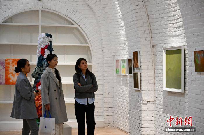11月8日,观众在展厅内参观。当日,“柔韧的边界 —— 薛滔个展” 在云南省昆明市开展。薛滔以扎染技艺为基础,利用材料柔韧特质,让时间、思想显色。中新社记者 李嘉娴 摄