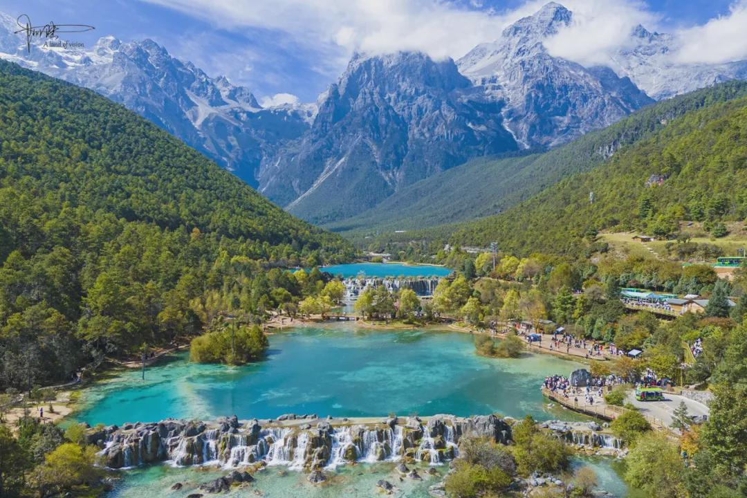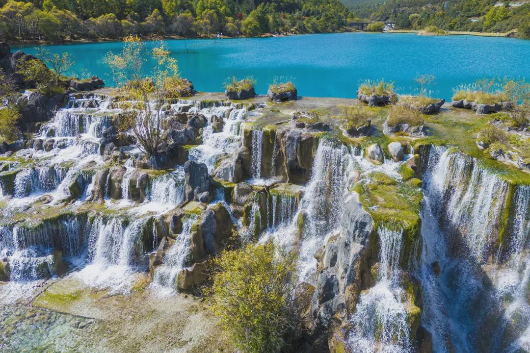 说实话,瀑布打造得非常成功,它们确实给玉龙雪山景区增添了更强的观赏性和吸引力,这点从路过的游客纷纷迫不及待地赶过去拍照就能看得出来。和以前一样,碰到这种人挤人的场合,我还是找个偏僻的角落或者坐在树荫下,用无人机“代步”过去打卡。