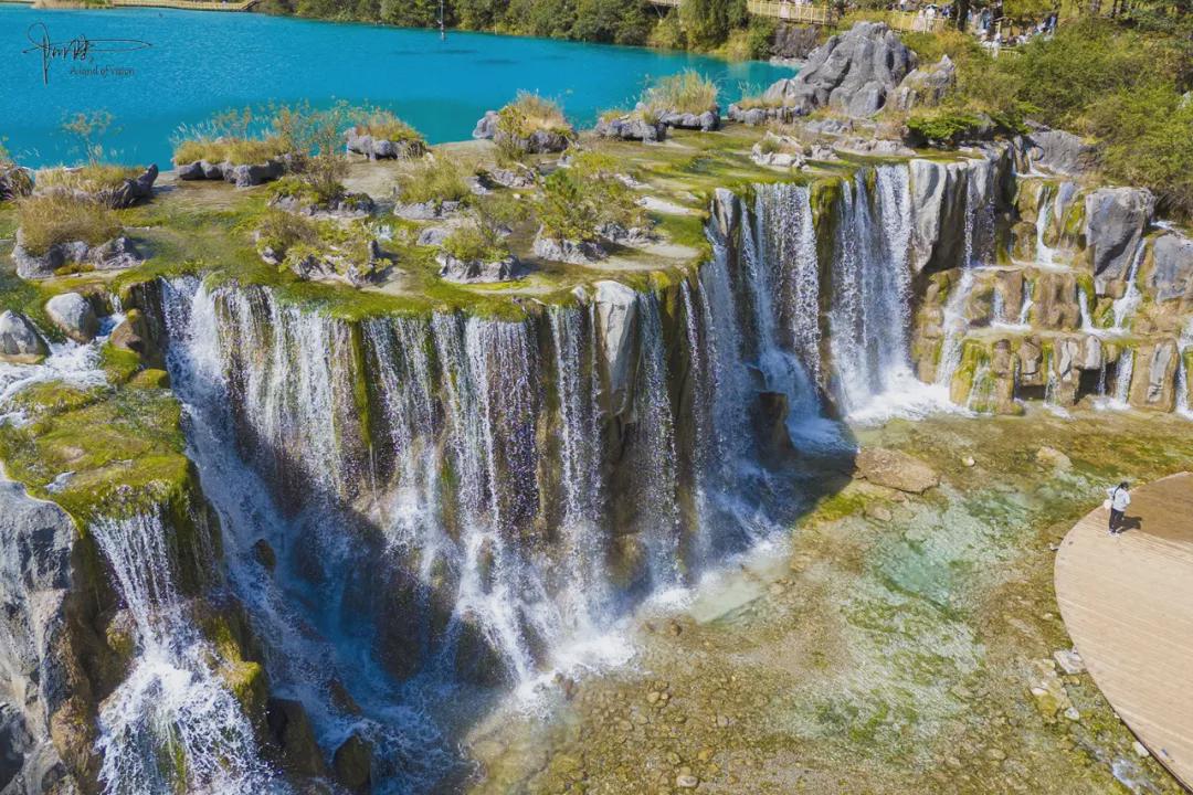 有趣的是通过高空俯瞰把蓝月谷的风景尽收眼底,本以为不过如此,却在随着人流往大巴乘车点走的时候,发现这边的瀑布非常有特色,相当漂亮。毫无疑问,蓝月谷的瀑布应该是景区精心设计和建造的,毕竟那种人为雕琢的痕迹很重,而最大的缺陷就是——一眼看去太完美了!