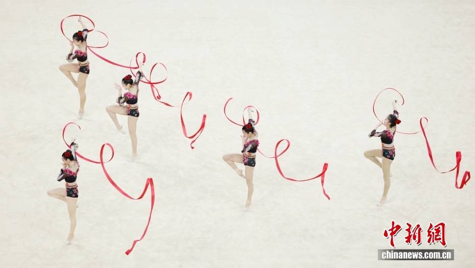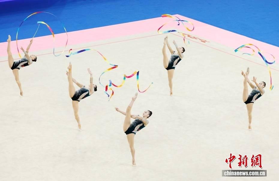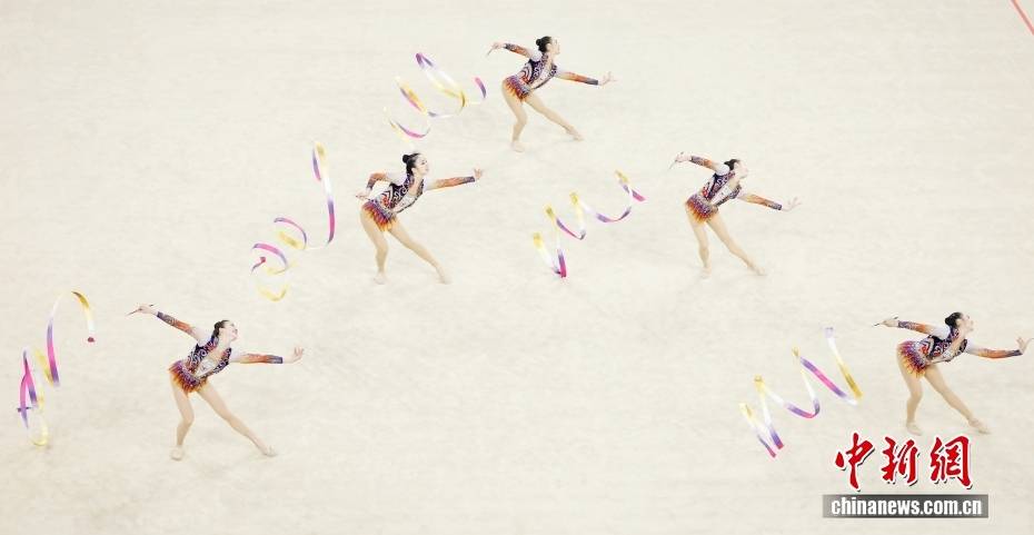 11月9日,第十五届全国运动会艺术体操项目集体全能预赛在深圳市坪山体育中心体育馆举行。图为浙江队在比赛中。中新社记者 韩海丹 摄
