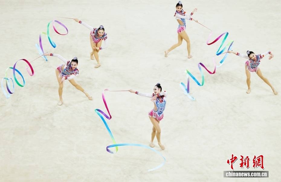 11月9日,第十五届全国运动会艺术体操项目集体全能预赛在深圳市坪山体育中心体育馆举行。图为陕西队在比赛中。中新社记者 韩海丹 摄