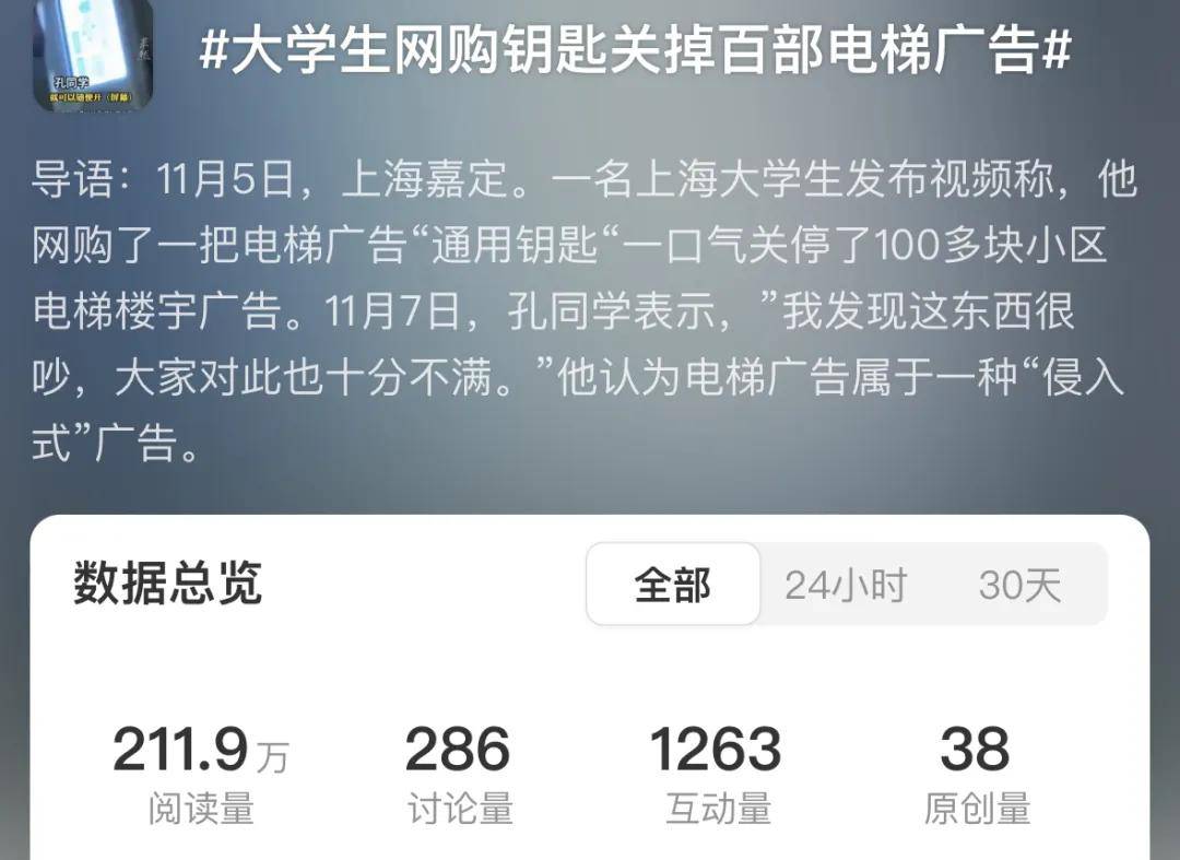 看到这一幕,网友们炸锅了!有人表示,电梯广告强制观看且收益不透明(业主付电费、物业收广告费),这位大学生做了大家不敢做的事,本质是维权行为。