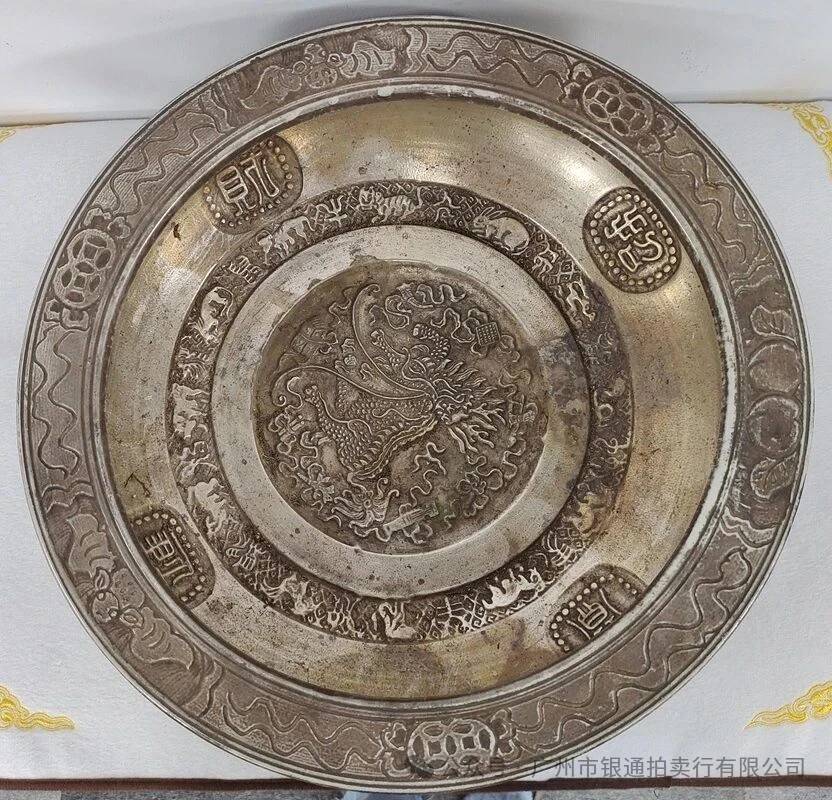 此件《招财进宝》聚宝盆直径39.5cm,高13cm,边缘环饰吉祥纹样,中央浮雕“招财进宝”字样与威严蟠龙,周围还分布十二生肖、钱纹等元素,布局繁复却层次清晰。整体造型大气庄重,将祈福寓意与工艺美感融为一体,尽显清代民俗器物的典型风格。盆身呈古朴金属色,经岁月氧化形成厚重自然的包浆,色泽沉稳内敛,纹饰细节在包浆映衬下更显古朴韵味,与清代金属器物的时代特征完全契合。此聚宝盆集“招财进宝”“蟠龙”“十二生肖”等多重吉祥符号于一身,是清代民俗文化与铸艺水平的集中体现。其铸造工艺反映了清代金属加工的技术水准,纹饰寓意承载着民间对财富、吉祥的殷切追求,对于研究清代民俗器物的文化内涵、铸艺审美具有不可替代的价值。