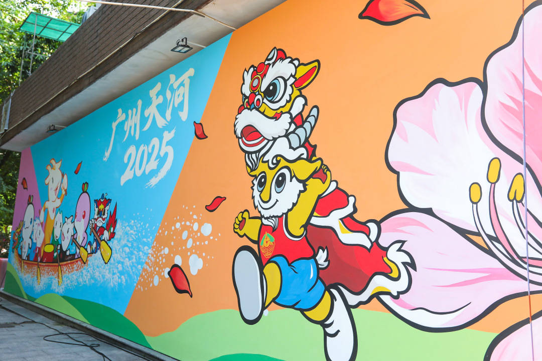 六运会、九运会、亚运会、十五运会吉祥物“同框”,粤港澳三地地标建筑“对话”,还有舞狮、龙舟等广府非遗场景都呈现在天河南步行街一幅30米长的彩绘墙上......在广州天河CBD的现代建筑群中,六运小区这座拥有38年历史的老社区正以独特的方式焕发生机。一面长达30米的旧墙经过美术工作者的巧手改造,变身为连接四个体育盛事的“记忆画廊”,成为近期广州市民争相打卡的城市文化新景观。