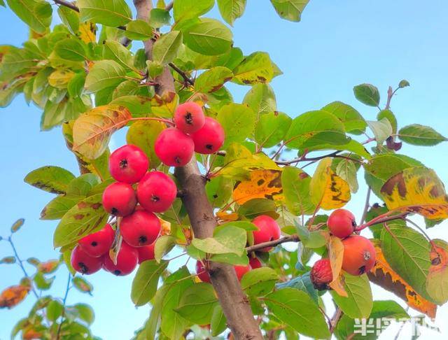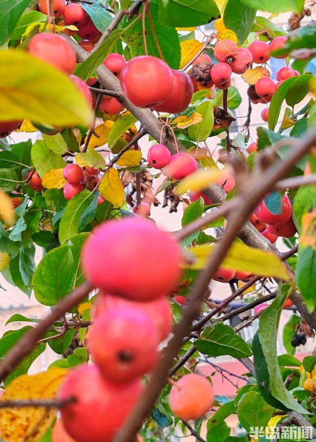 11月10日,在市区不少街头和小区绿化带内,树上被一串串果子压弯了枝条,这就是海棠果。红彤彤的果子像是红透了的玛瑙,非常惹人喜爱。