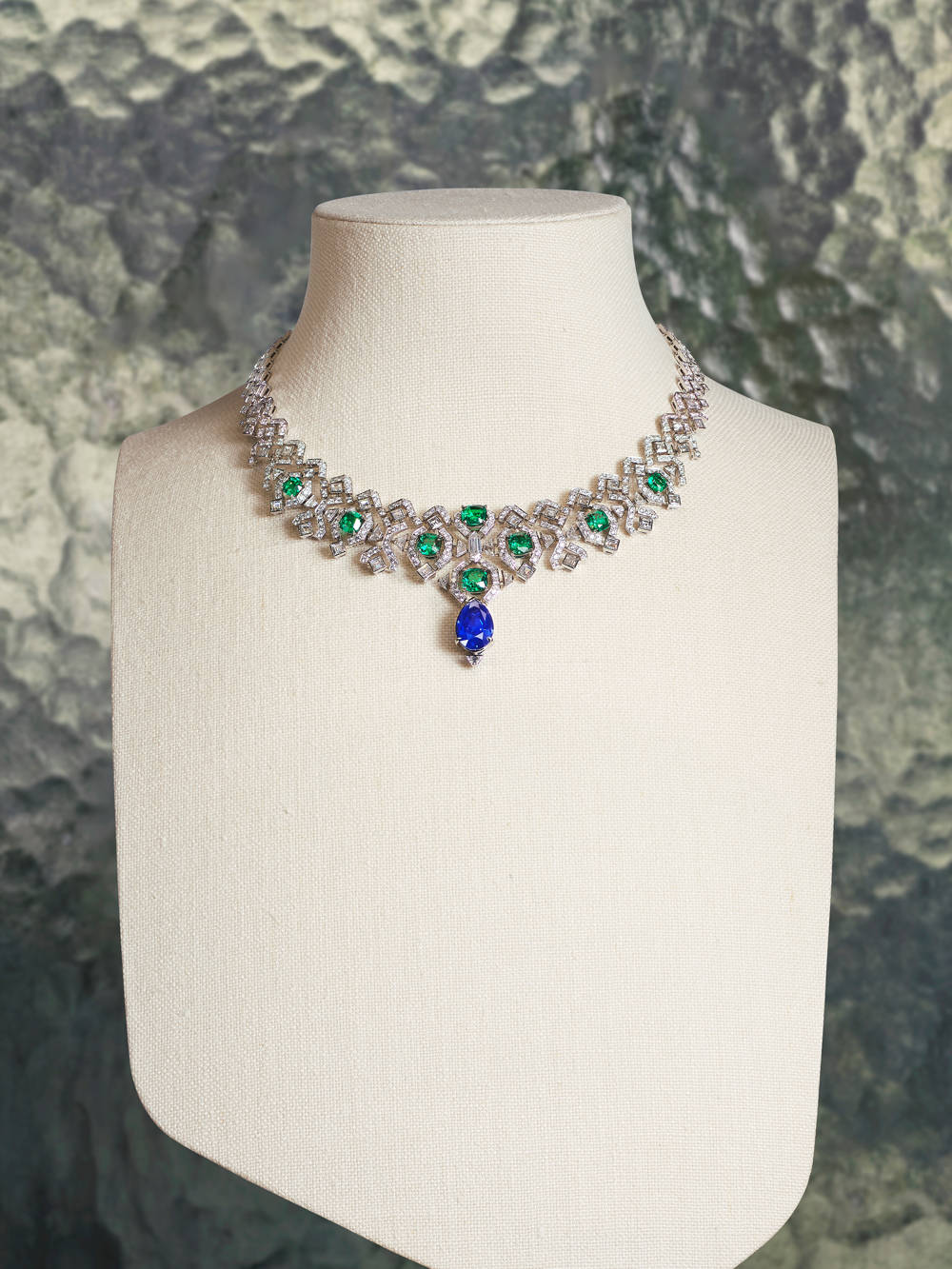 这款项链将一颗梨形蓝宝石与八颗祖母绿巧妙搭配,演绎卡地亚标志性的蓝绿色彩组合───孔雀图案,祖母绿的深邃色调呼应蓝宝石的柔和质感,令整体色彩细腻和谐。作品由一系列几何元素铺展而成,衬托祖母绿的枕形造型。宝石与镶钻图案交替排列,在虚实相间的布局中达至平衡。镂空设计增强了律动感,而方形与锥形钻石构成的几何细节犹如节奏符号,为整体构型注入强烈张力。