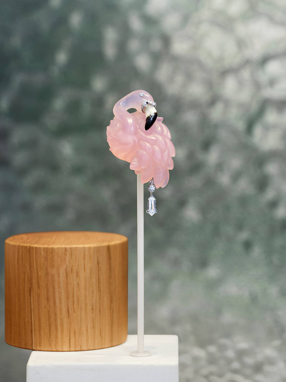 这款胸针旨在致敬卡地亚积极保护与传承的珍罕工艺───宝石雕刻(Glyptics)。宝石工匠以一整块粉色石英,雕琢出火烈鸟的灵动形象。从玛瑙鸟喙到柔软羽毛,火烈鸟的形态特征皆刻画得惟妙惟肖。羽毛下方亦垂悬一颗风筝形钻石,为整体的柔和色调平添一抹耀眼光辉。