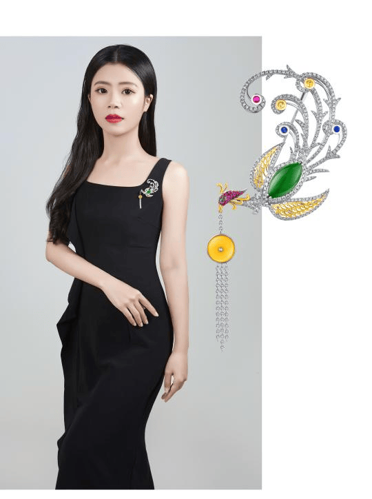 让许泽燕获得诸多荣誉的“百凤来仪”系列作品,灵感也来源于潮汕嵌瓷。嵌瓷上翩翩起舞的凤凰,是她在童年关于美好事物最初的想象。许泽燕希望通过这个系列作品,表达“百凤来仪天下安宁”美好愿景,表达对祖国的祝福,向人们传递希望和温暖。“百凤来仪”系列作品也被收录进了《2021首饰设计师优秀作品集》和《翡翠》杂志。