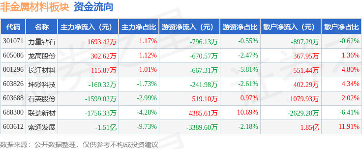 从资金流向上来看,当日非金属材料板块主力资金净流出1.65亿元,游资资金净流出860.87万元,散户资金净流入1.74亿元。非金属材料板块个股资金流向见下表: