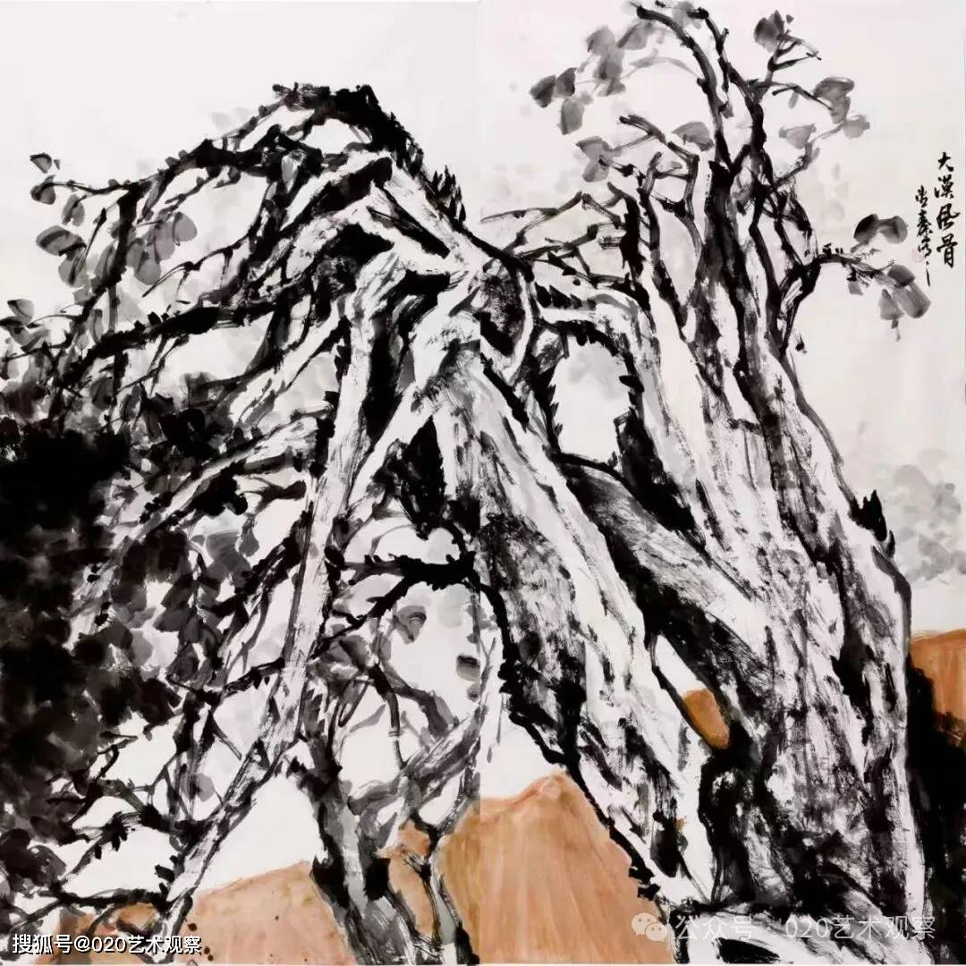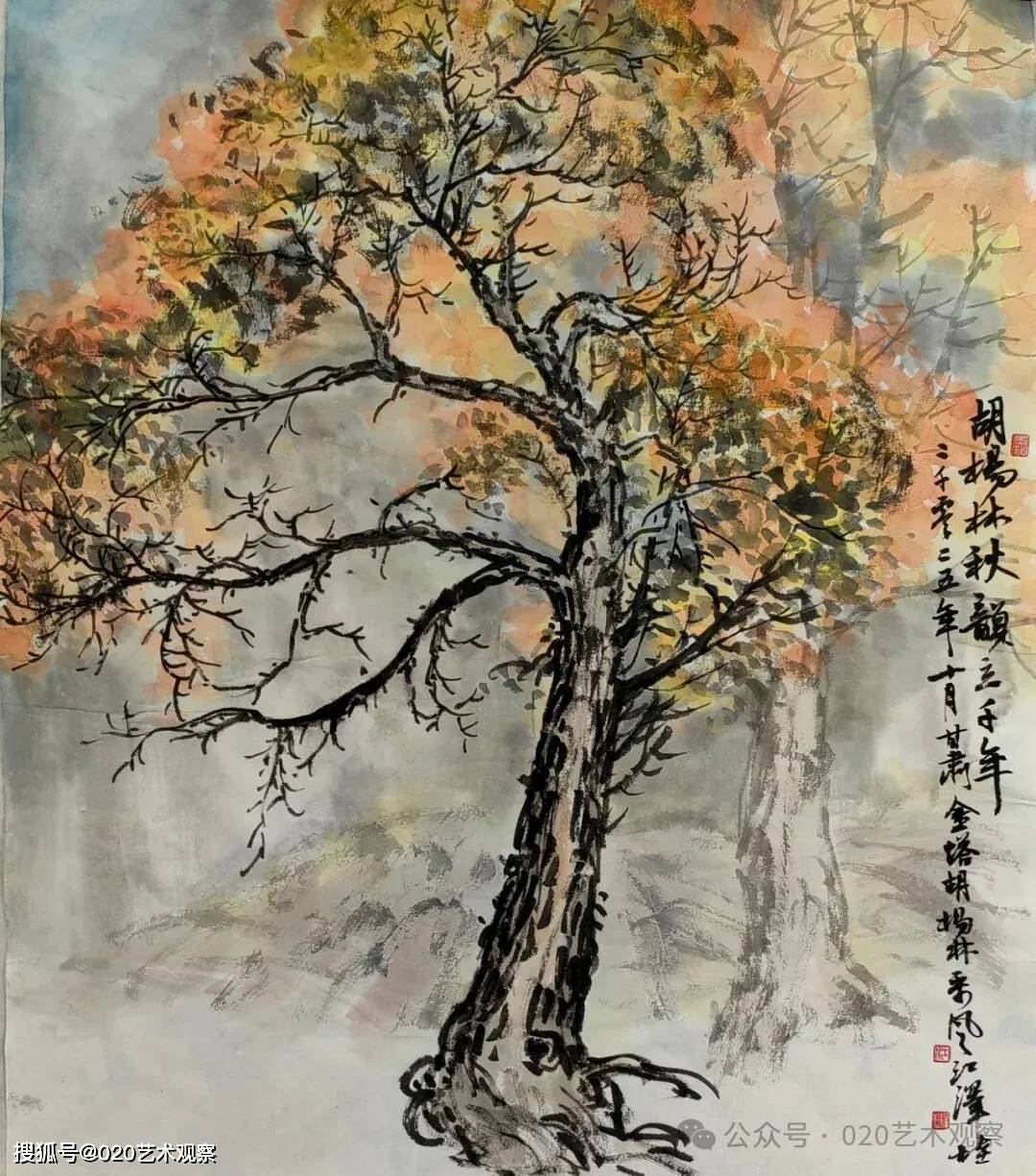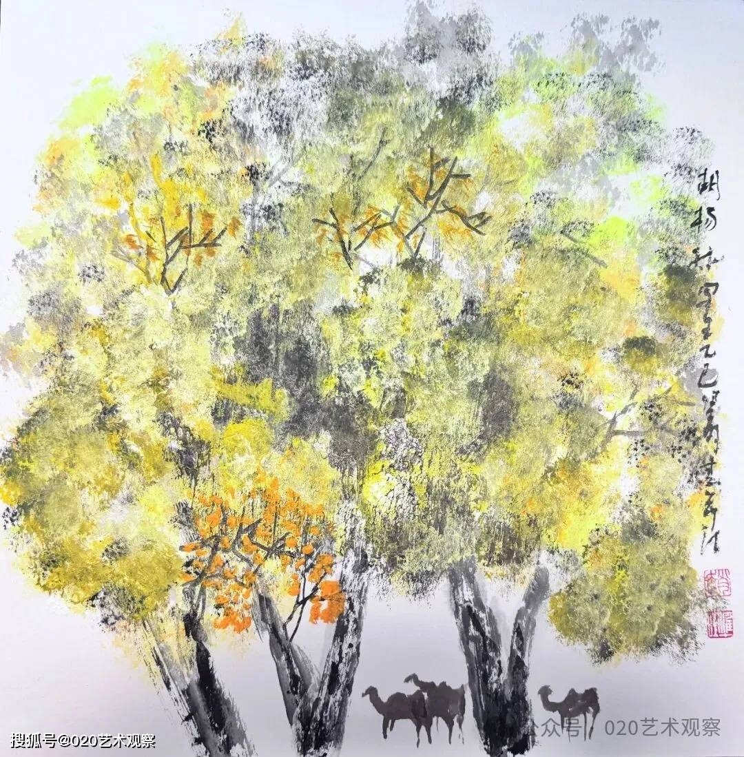仿佛是画家们前世在胡杨根茎施了墨注了彩,今生前来朝拜生而不死的灵,前来撷取精神的绚烂。永成干墨皴出胡杨凌霜傲雪的骨气,诠释了“画家不应该带着某种模式去再现自然,而应该从源于自然的内心感受去寻找用何种形式表现。”根基重墨轻色,光荣的胡杨自然只长出筋条骨骼,兀自临风,嶙峋清矍;小华凭空一截焦墨胡杨,潇洒甩发,仰头直面,逼你去思考“根”的问题。绍基的枯杨竟透着皑皑祁连的况味。根本处注了彩的,陈炜偏爱柠黄,便赋予了澄明透亮的品质;少艾独钟淡橘红,就沾了《橘颂》的气韵;铁威的蜜蜡黄在老枝上缀满青春的灯笼;百揆的明黄薄绿老橙红,半垂湖畔半浮水,虚实浑然;楚娟深浅喜藤黄,树梢戴上了典雅桂冠;楚乔唯恐错过夏春秋,把季节的颜色次第敷上枝条;泽桂摘来一片秋光,题诗一首:“金塔胡杨立汉边,千年守候意拳拳。金黄一片秋光里,似诉沧桑韵满笺。”思东的胡杨看似无章疯长,却潦而不草,匠心自在;运成淡墨胡杨让人生出“浓睡不消残酒”的梦幻;陈年发宽荧幕展示的胡杨林,苍而不凉,描摹出他自己题写的“风啸志巍,日炙心坚”的胡杨格,道尽千载不朽的胡杨魂。