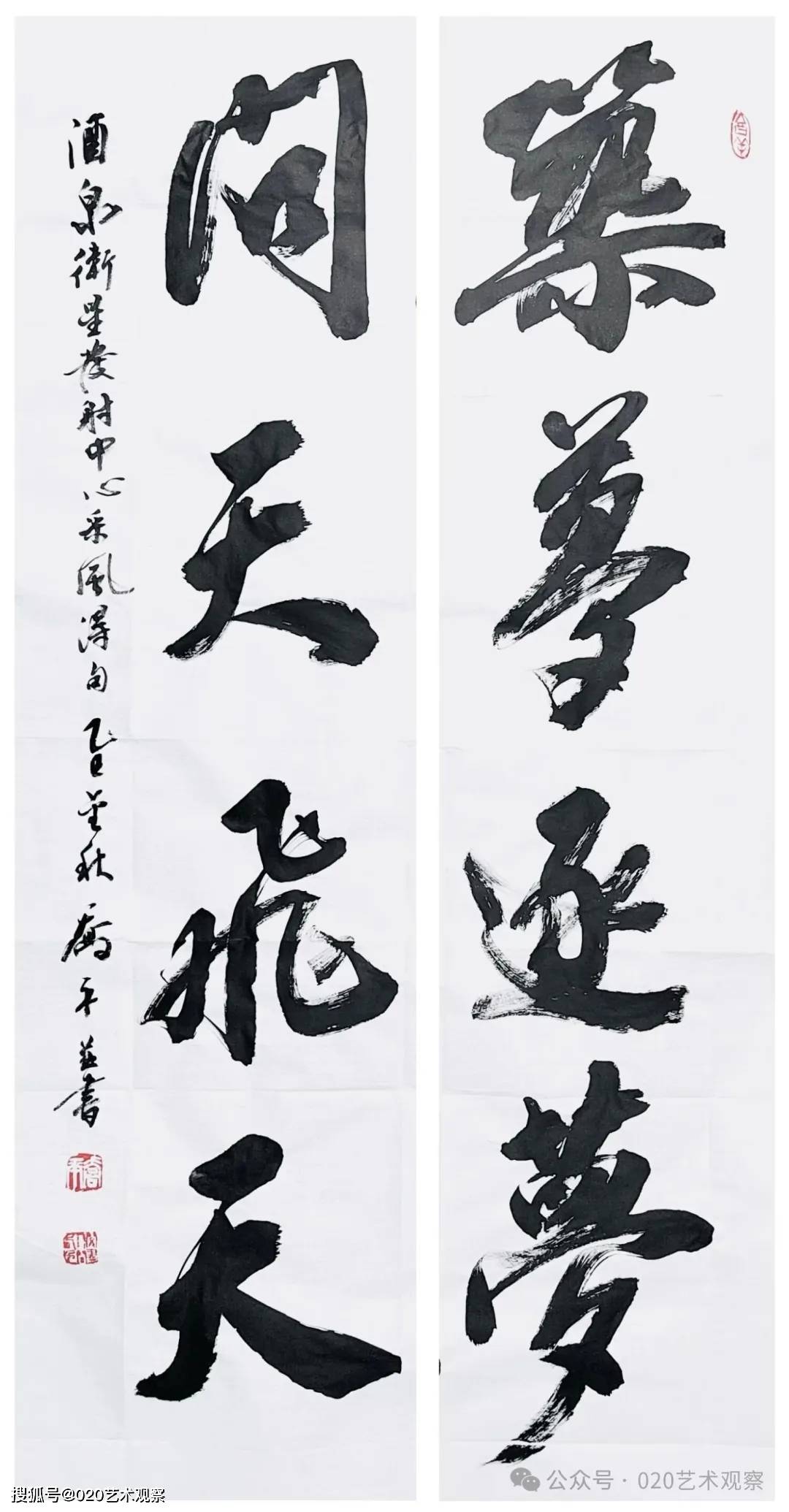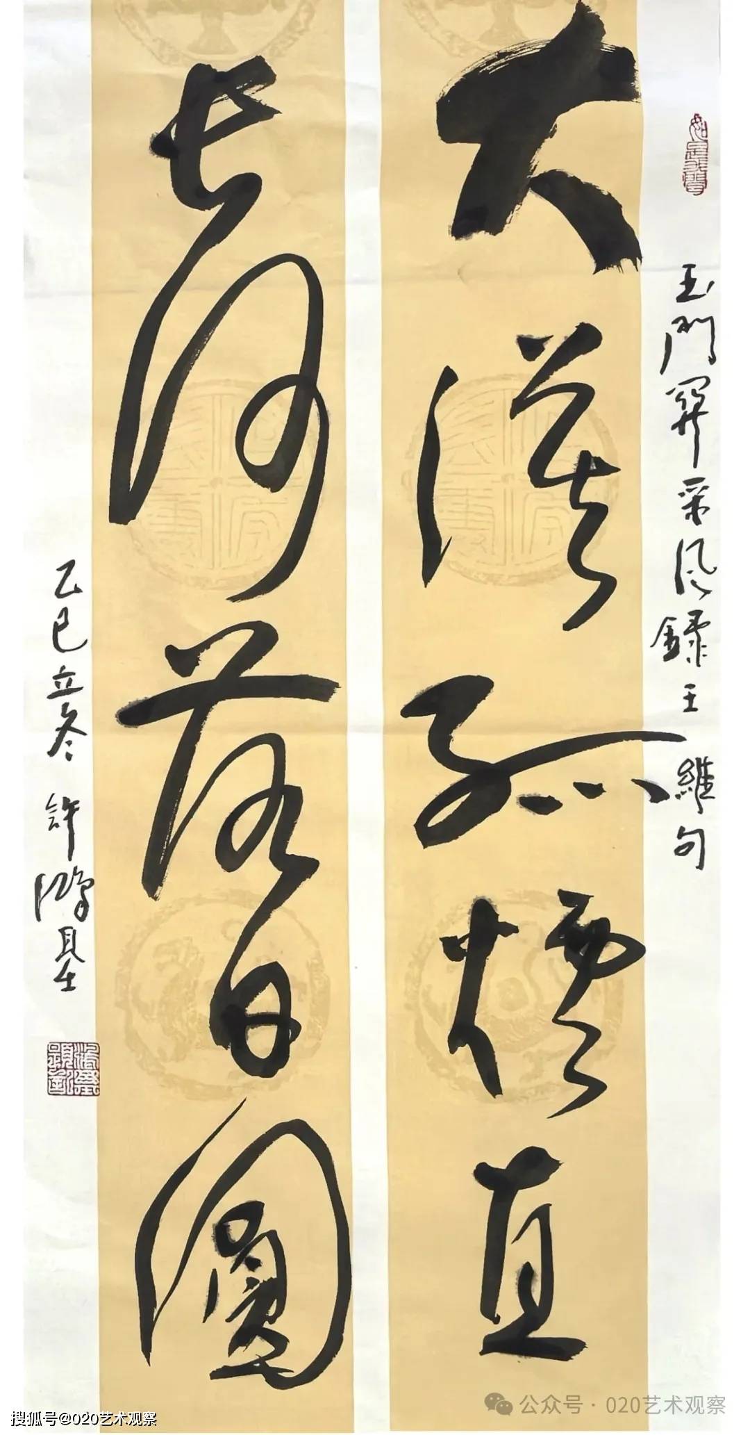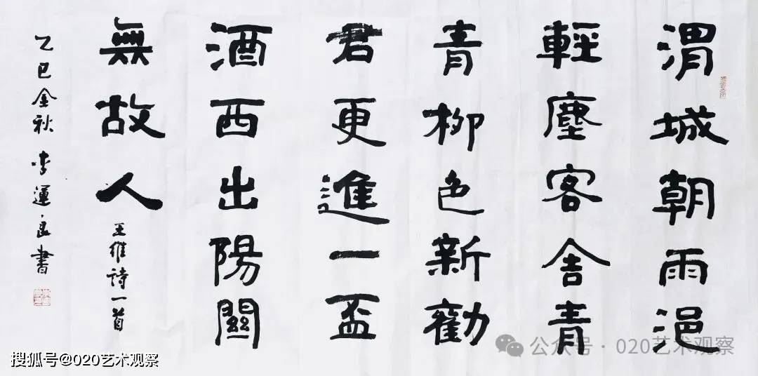 画如是,书亦然。看许鸿基的草书“大漠孤烟直”的“孤”字,恰似“不教胡马度阴山”的龙城将军,战袍飞扬,策马横刀,掀起胡天百丈沙尘,“飛”字长长的一竖又像铁骑在关塞踏出的血泪蹄印。他的古隶如玉门关大方盘的城垣遗垛,默默“大漠孤烟守岁”。与之异曲同工的运良楷书,大观字字禅定,细看运笔蹇行,飞白处正是万里城墙无声承受千年风雨消蚀的斑驳。乔平的行书无需阳关劝酒也酣畅淋漓,中锋如杵,撇捺大开合,尽显“我是一个兵”的豪气。