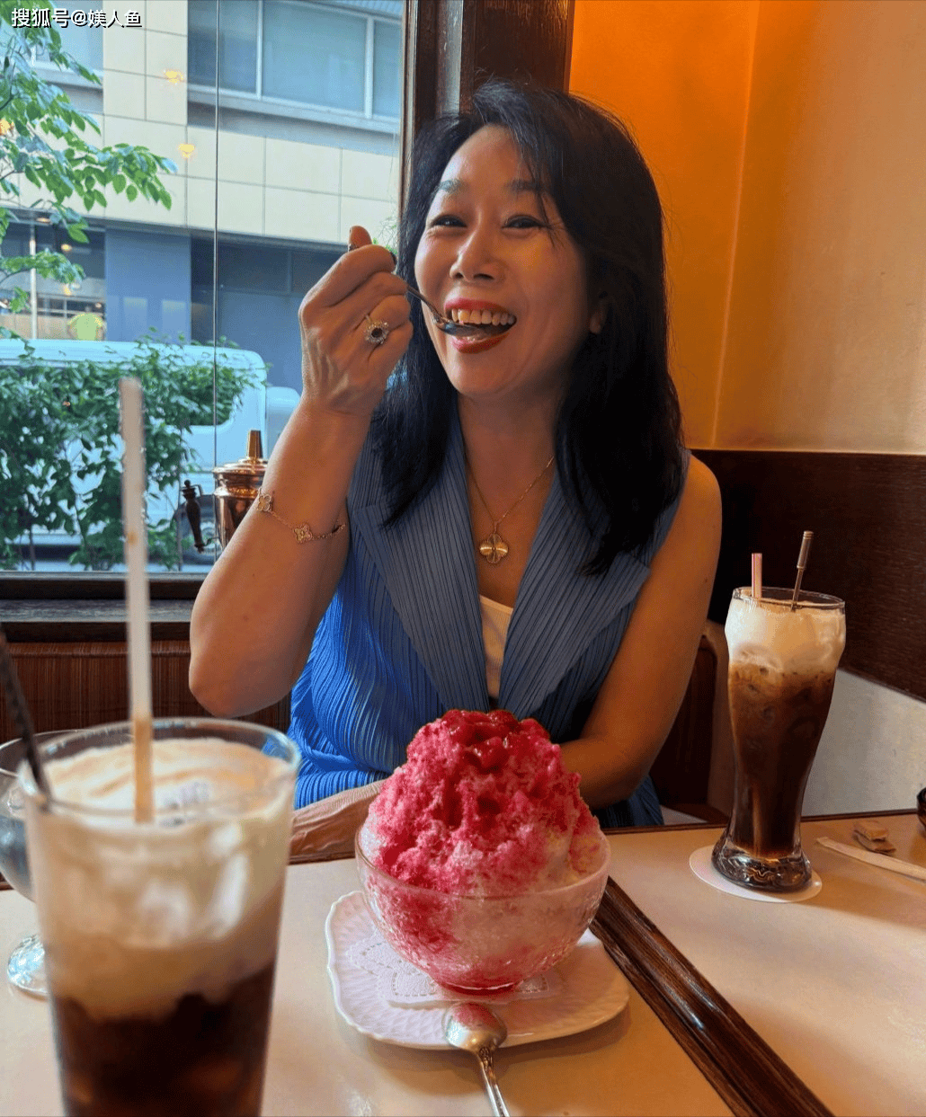 照片中,张馨予的妈妈吃着冰淇淋点心,其姿态非常的优雅,一看就是一个对生活的非常精致的人。