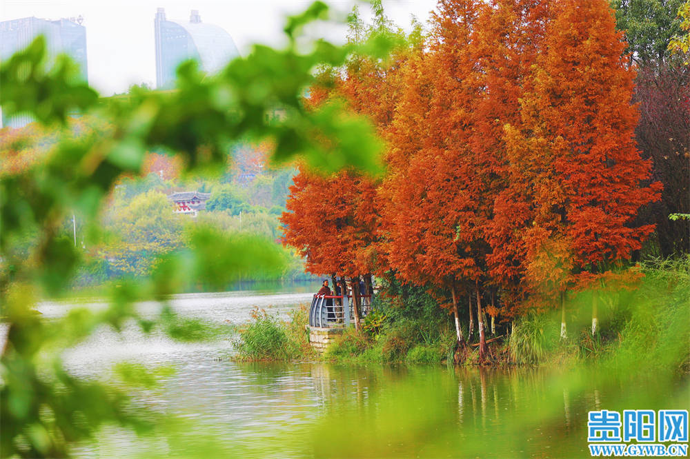11月11日,贵阳市民在浓郁秋色的观山湖公园悠闲散步赏秋色美景,惬意十足。时下虽已立冬,但观山湖公园里的秋色却也正是最为浓郁的时候,公园里的梧桐、银杏、水杉等高大乔木及灌木树叶纷纷展示出秋冬季节里特有的色彩,放眼望去,每一处都如一幅幅耐看的写意油画。