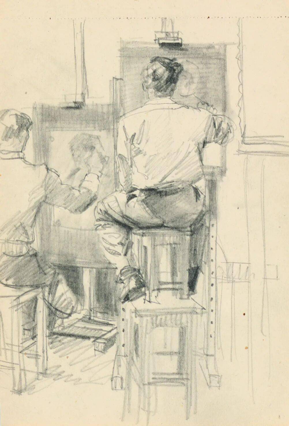 1957年,毕业旅行写生途中在船上观摩马克西莫夫写生(中央美术学院档案室存)