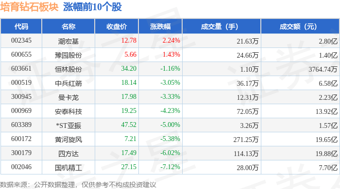 证券之星消息,11月12日培育钻石板块较上一交易日下跌4.92%,沃尔德领跌。当日上证指数报收于4000.14,下跌0.07%。深证成指报收于13240.62,下跌0.36%。培育钻石板块个股涨跌见下表: