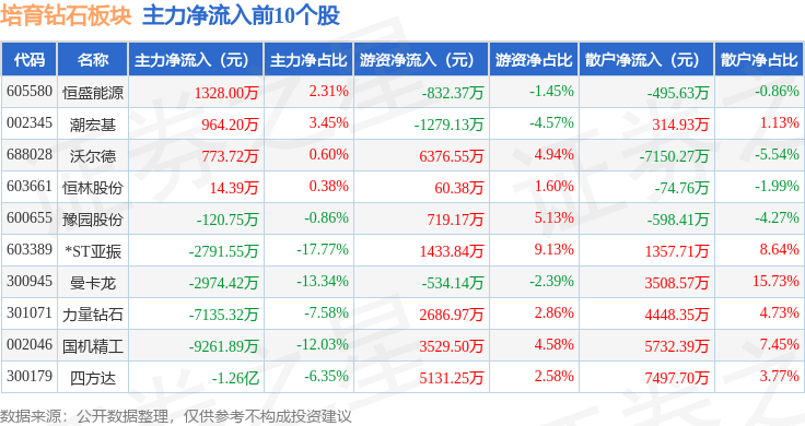 从资金流向上来看,当日培育钻石板块主力资金净流出10.56亿元,游资资金净流入2.14亿元,散户资金净流入8.42亿元。培育钻石板块个股资金流向见下表: