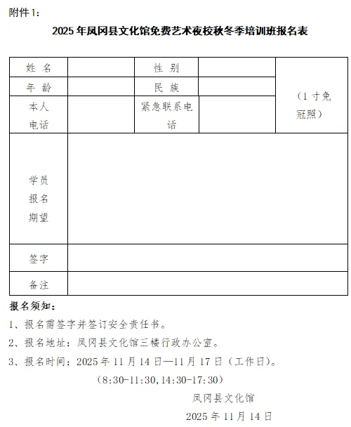 2、报名方式:凤冈县文化馆三楼行政办公室现场报名(报名时需交一寸免冠证件照及填写一张报名表,并签安全责任书)。