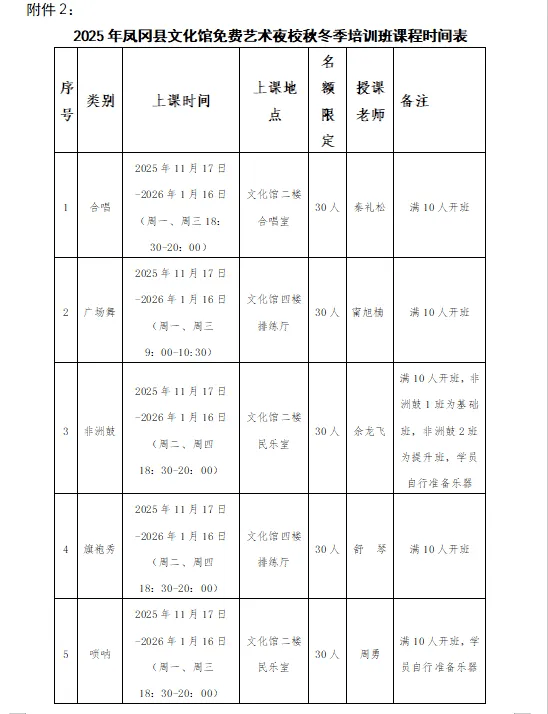 为深入学习贯彻党的二十届四中全会精神,贯彻落实《中央办公厅、国务院办公厅<关于加快构建现代公共文化服务体系的意见〉的通知》和文化部、财政部《关于推进全国美术馆、公共图书馆、文化馆(站)免费开放工作的意见》,实现全民艺术普及和文化馆全面开放,凤冈县文化馆拟开展2025年免费艺术夜校秋冬季培训工作。
