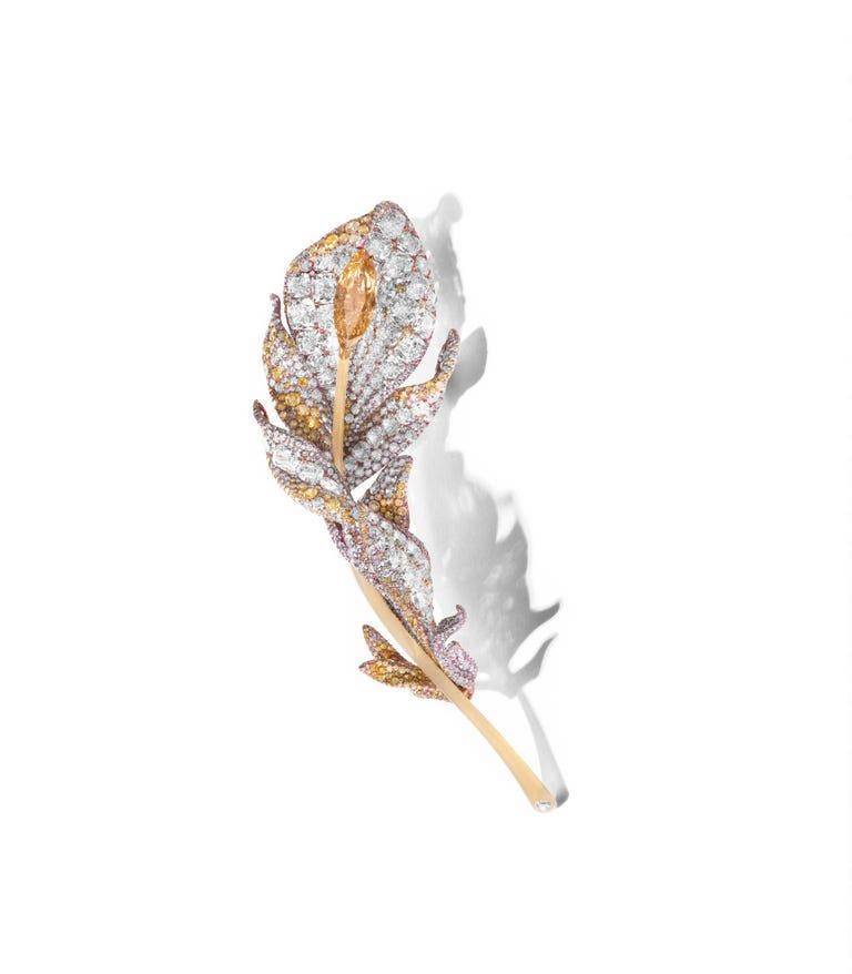 19世纪末至20世纪初的美好年代(Belle Époque),高级时装(Haute Couture)的概念在巴黎开始萌芽,贵族们在出席各种舞会时常佩戴奢华的冠冕并以羽毛作为点缀,以彰显品位与身份。2016年,珠宝艺术家Cindy Chao第一次以此为灵感创作了大师系列羽毛胸针 “金黄羽饰胸针”,并在巴黎古董双年展上大放异彩。次年的2017年香港佳士得春拍上,这件作品以超估价近两倍的价格成交,创下全球拍场近二十年以来羽毛珠宝作品最高价纪录,成为收藏领域的扛鼎之作。自此,以羽毛元素也成为品牌又一经典,在艺术家不同心绪的演绎下,幻化出多样的美感与生命张力。