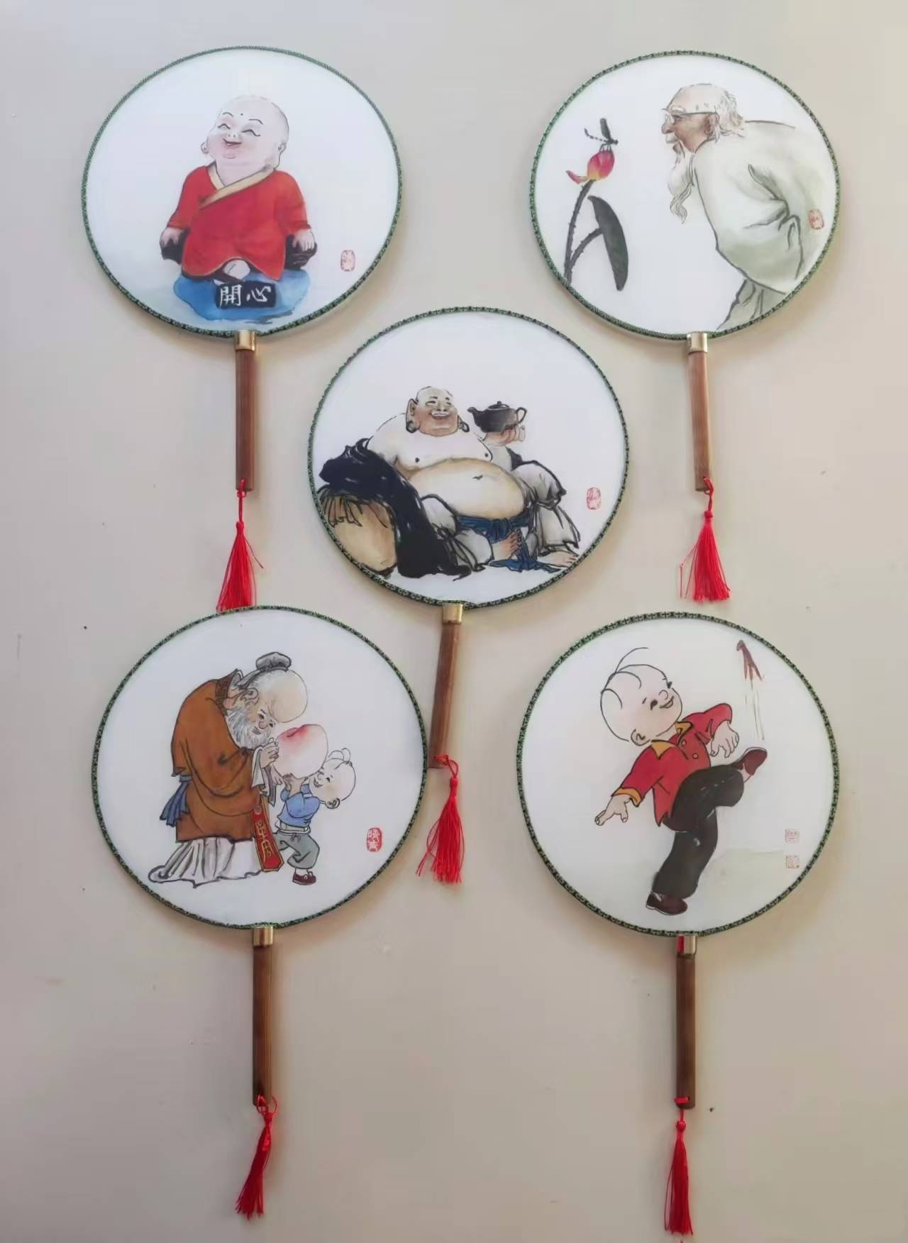 所有团扇均采用竹木扇柄,搭配红色流苏,扇面边缘饰有绿色花边,既保留了传统团扇的典雅形制,又通过生动的人物绘画赋予其鲜活的生活气息,是传统工艺与民俗文化、卡通艺术融合的体现,兼具装饰性与文化内涵。