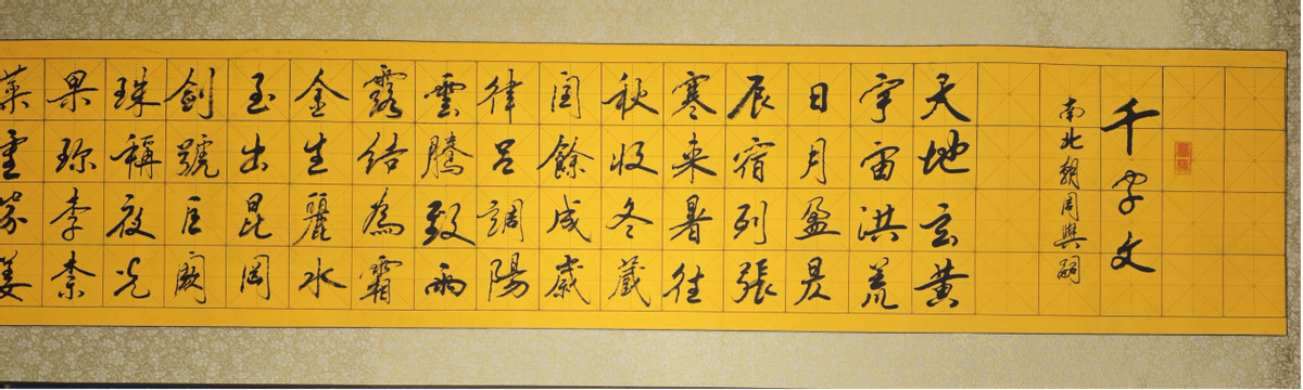 这幅《千字文》书法长卷长达 1941cm、宽 34cm,是李炳超书法艺术的集大成之作。作品以行草书就,在长达近二十米的篇幅中,他将《千字文》的文字内容一气呵成地呈现,笔法流畅自然,笔画粗细变化灵动,如 “天地玄黄,宇宙洪荒” 开篇数句,笔势开张大气,尽显行草书法的潇洒不羁;中间段落如 “剑号巨阙,珠称夜光” 等,字体结构严谨又不失飘逸,笔画间的牵丝映带自然连贯,体现出极强的笔墨驾驭能力。布局上,长卷采用方格规整排列,却在规整中蕴含变化,字与字、行与行之间呼应紧密,墨色浓淡相宜,既保证了整体的和谐统一,又通过笔墨的轻重缓急展现出《千字文》文字的韵律与意境。