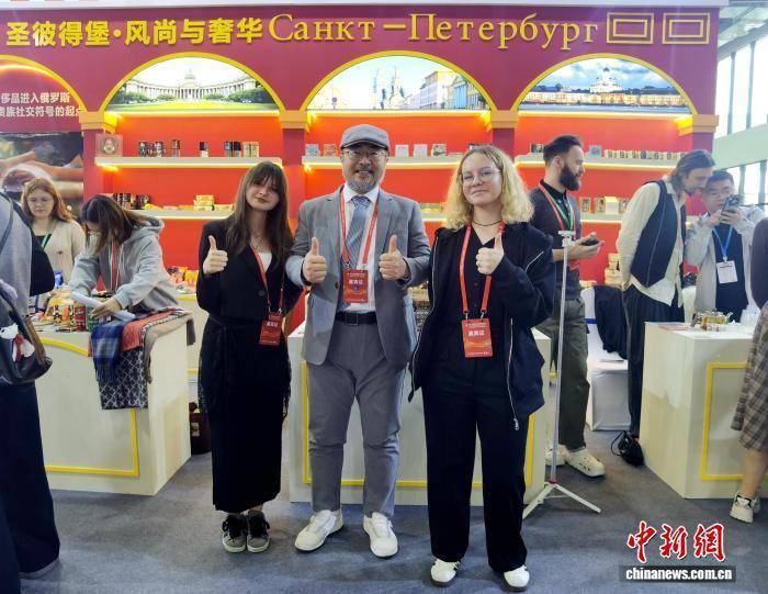 图为俄中文化交流协会执行会长乔翔鹏在俄罗斯馆内与参展商合影。受访者供图。