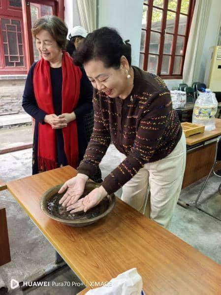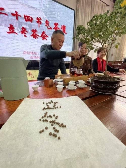 参会嘉宾和茶友在充满仪式感的净手、签到之后,缓缓步入一场融合视觉、嗅觉与味觉的冬日雅集。大家一同欣赏了意境悠远的仿吴湖帆山水画《云表奇峰》、金黄灿烂的黄淮决明,亲手捻制“出水芙蓉”香丸,品味应时的立冬节气茶——滇红。在优雅的茶艺表演后,青年学子飘逸灵动的太极扇表演,与金孔雀葫芦丝艺术团表演的电吹管三重奏《南泥湾》《敖包相会》的悠扬旋律交相辉映,余音袅袅,令人沉醉。现场还共同赏读了元稹《咏廿四气诗·立冬十月节》、欧阳勋《试和郑谷茶诗》,以及书法家、诗人高象昶先生为本次茶会挥毫创作的诗作,墨香与茶香交织,意蕴绵长。