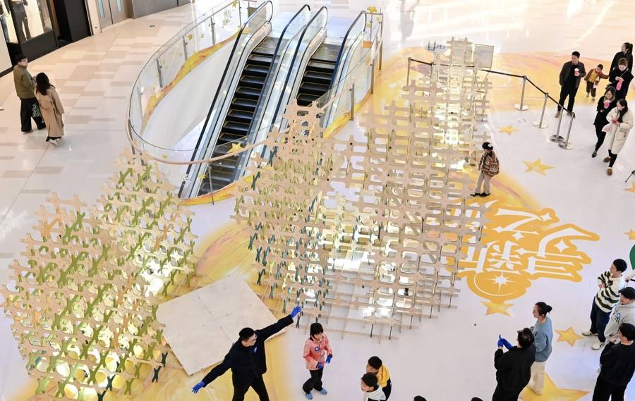 活动期间,虹桥新天地联动上海大学上海美术学院、同济大学、中国美术学院与艺术家幽灵电力,共同呈现4组兼具艺术性与互动性的光影交互装置。上海大学上海美术学院在商场南区中庭打造“‘新’运松林”,邀请客人参与搭建由环保彩绒板组成的5米高“许愿林”,营造链接希望与互动的公共艺术实践;同济大学郝洛西教授团队在南区户外灵感花园打造“‘新’语流光”,观众在荧幕前挥动手势即可触发吉祥话,以科技诗意连接个体,打造沉浸式情感体验;中国美术学院薛梦婷、王郅之、章俊杰创作的“竹织星野”,以光影竹编构造星夜梦境,同时该区域联动北京微爱基金会发起“微爱聚光”公益活动,将消费行为转化为善意传递;艺术家柴浩然(幽灵电力)的作品“骑到星星升起”亮相北区,观众围绕帷幕骑行即可升起星星,以互动参与激活商业空间活力。