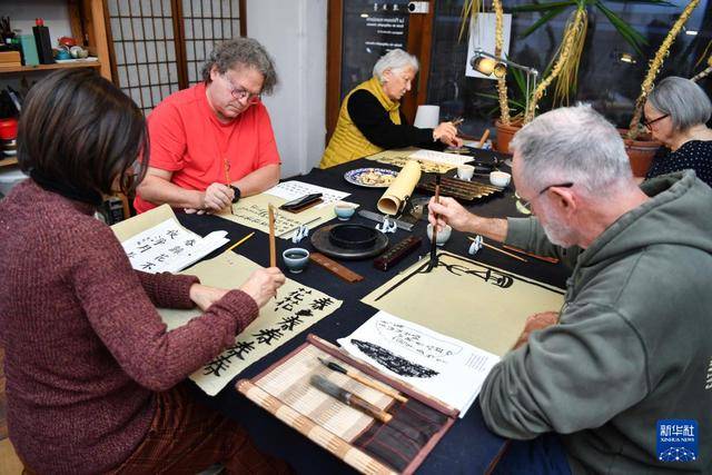 11月19日,在瑞士日内瓦,“乐鱼亭”书法工作室的学员在练习书法。新华社记者 连漪 摄