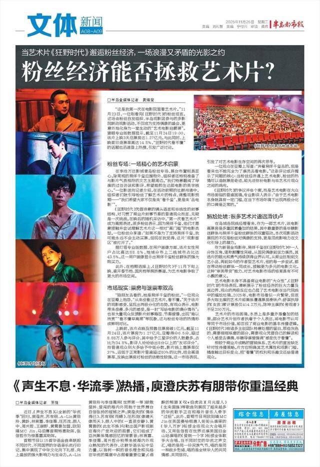 艺术电影本身就不具备商业电影的“大众性”,《狂野时代》的市场表现,清晰展示了粉丝经济的巨大力量与其边界,观众的两极反应也凸显了艺术电影在当代院线中的尴尬处境。