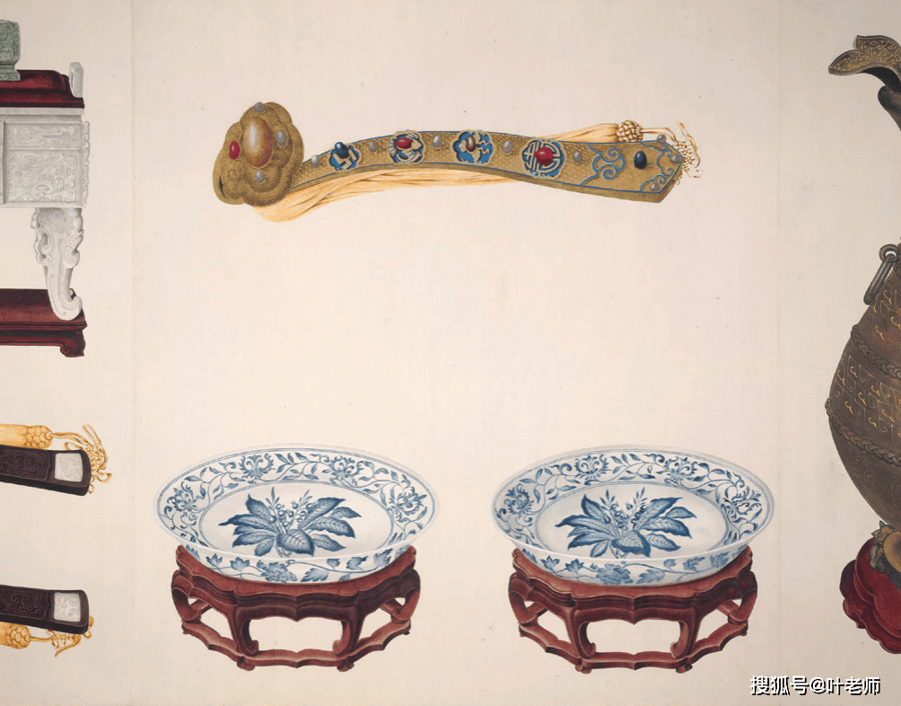 清宫典藏古玩器物与日常使用器物皆是配设器座的传统,以求达到“无器不座,无器不雅”之境地。造办处设有“木作”“牙作”“漆作”,其中一个主要的功能,就是为彼此宫廷古物新器配制底座。因此,器座的设计,本身就是一门高深的艺术,依据器物的形状、颜色、纹饰等来匹配。器座以木为主,兼顾各种材质,就木材一项,也细分多种具体的品类,例如紫檀、黄花梨等硬木为大宗。分别收藏于英国 V&A 博物馆和大英博物馆的《雍正古玩图》手卷所绘各式宫廷古物,皆配置各式器座,琳琅满目,精彩非凡,可为我们窥视当年宫廷审美之盛况。(图 1、2)