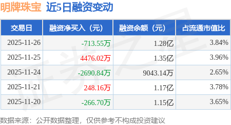 证券之星消息,11月26日,明牌珠宝(002574)融资买入3382.6万元,融资偿还4096.15万元,融资净卖出713.55万元,融资余额1.28亿元。