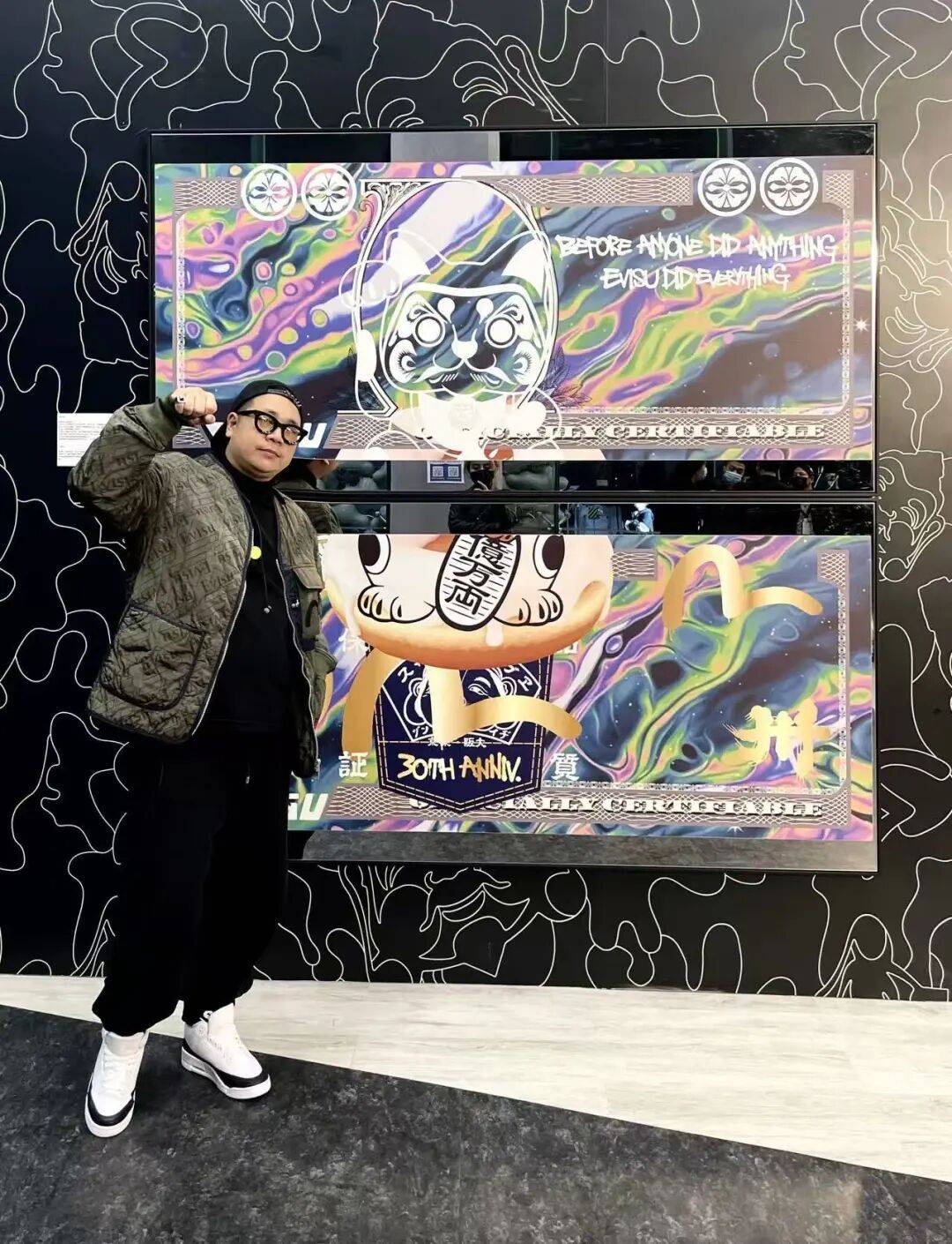 商业合作带给他许多意料之外的惊喜。例如,在为EVISU 30周年创作的作品中,他融合品牌logo、福寿纹样与镜面元素,最终作品被宋茜、王一博等知名艺人收藏。在与凯迪拉克的合作中,他通过电脑生成粒子艺术,将品牌logo转化为具有故障艺术效果的动态图像。这些合作不仅拓展了他对媒介与技术的理解,也使其艺术语言在更广泛的语境中传播。