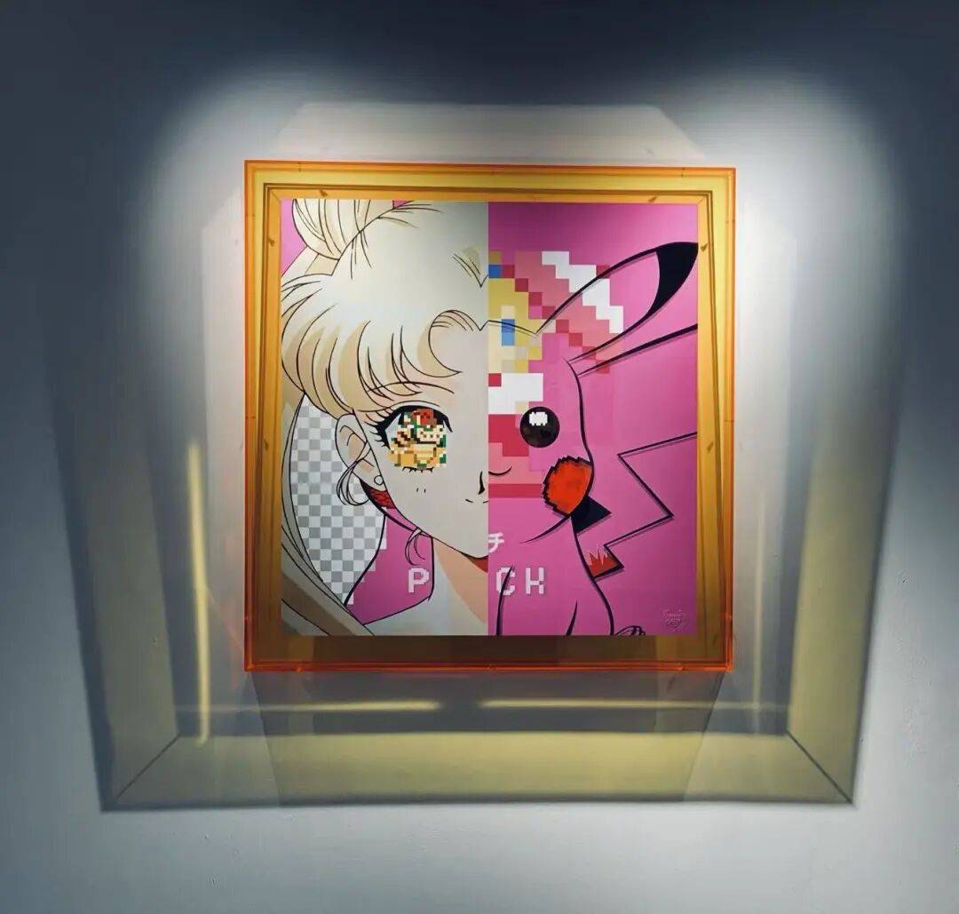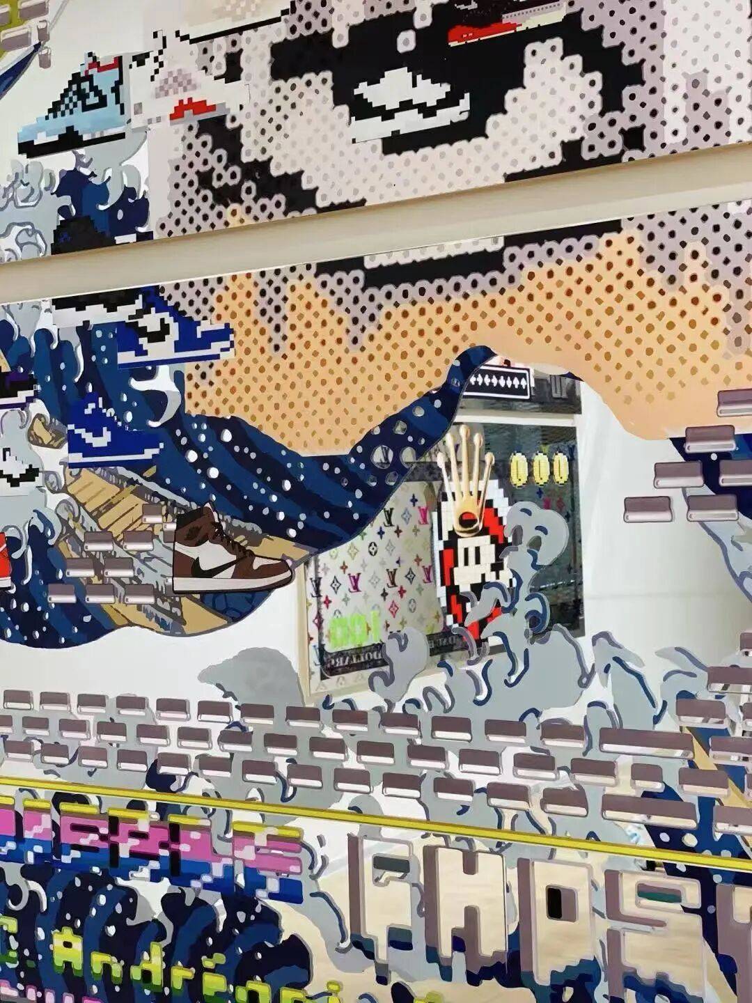 “像素能量”是张依楠创作中的另一核心概念。对他而言,像素不仅是数字图像的基本单位,更是童年记忆的载体——红白机、诺基亚手机中的像素化图像以及从小生活在梧桐区ArtDeco建筑中的马赛克,构成了他的视觉经验。他将像素与“慢生活”联系起来,认为像素带来的模糊感,正是对追求极致效率的快节奏时代的一种温柔反抗。他出生于4月22日,数字“422”的对称性使他对秩序感有着天然敏感,而像素点的规律排列正呼应了这种内在秩序。在创作中,他通过镜面、数码印刷等材料,将抽象的像素能量具象化。例如,在输出作品时,一位外国艺术家指出其风格类似“Atari风格”—— 一种早于世嘉与Game Boy的复古电子迷幻风格。这让他意识到,像素不仅是技术符号,也是一种跨越时空的视觉语言。