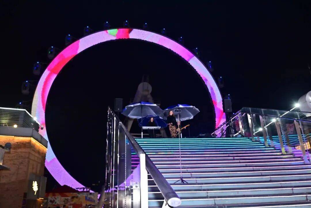 静安大悦城摩天轮天台,一支由跨国音乐人组成的新锐乐队,白俄罗斯主唱领衔的Aurora Echo乐队,用古典与现代交融的跨国之声点亮夜空。