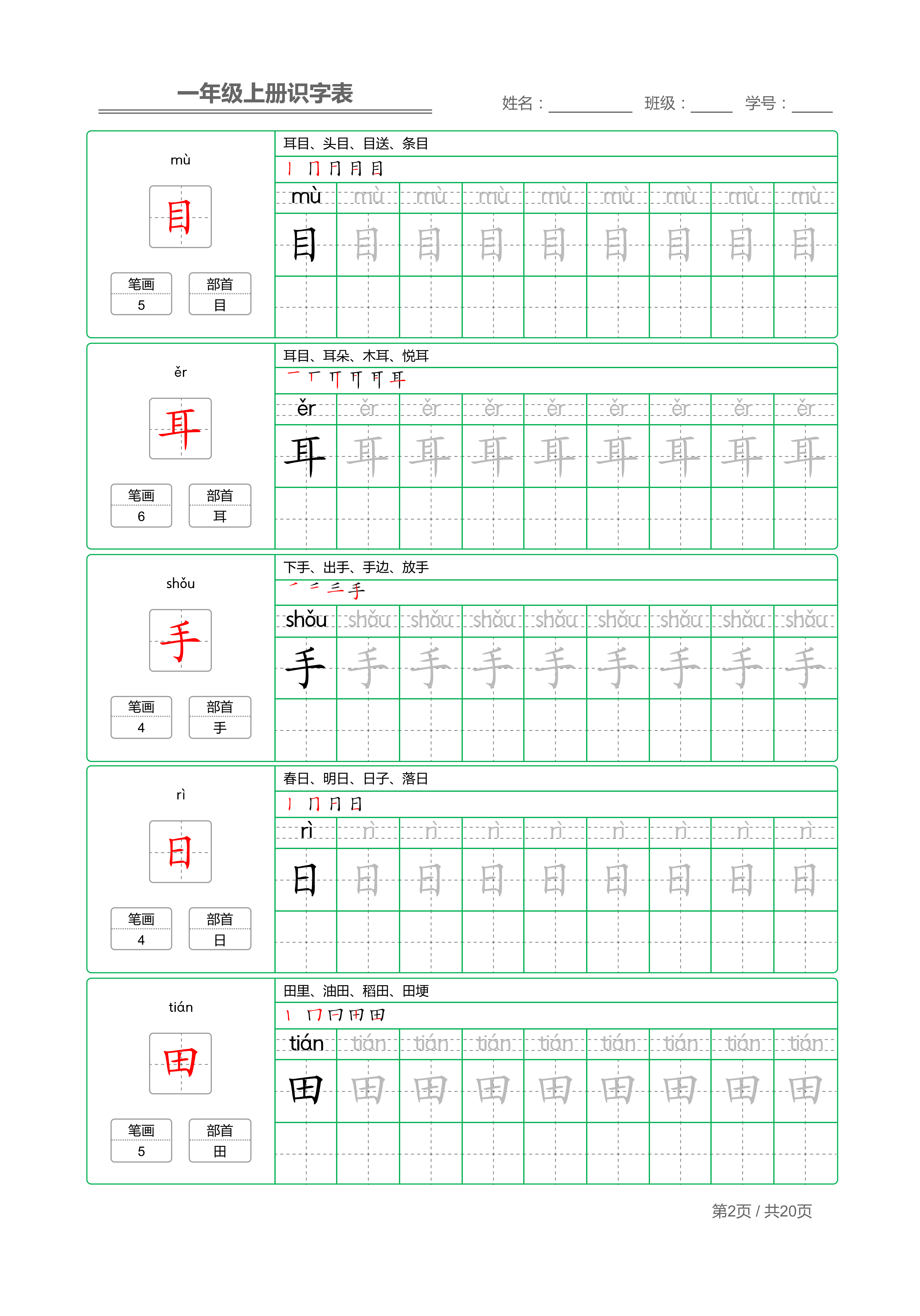 今天给大家分享:一套一年级上册识字表,它把每个字的学习拆得特别细:不仅有笔画、部首,还配了组词(比如 “禾” 对应 “禾苗、禾场”),甚至标了笔顺演示。练字的同时,能直接知道这个字怎么用,把 “写对” 和 “会用” 融成了一件事。