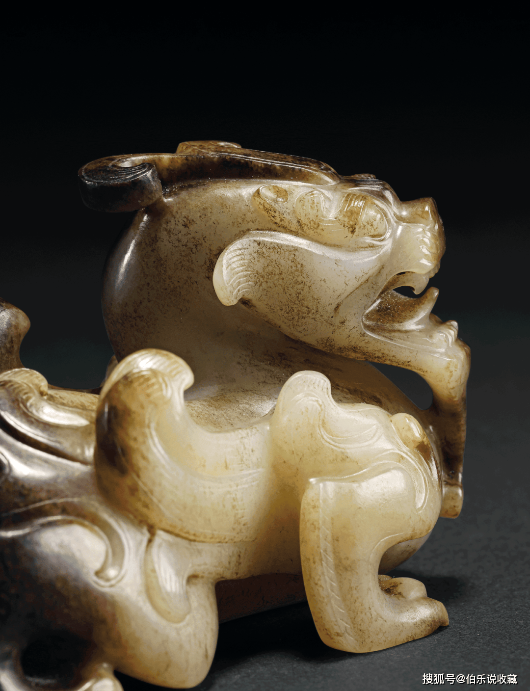 辟邪为中国古代最著名的瑞兽之一,始见于汉,一直延续至清代。此辟邪为白玉所雕,整体受黑色沁,沁色丝缕入里。辟邪身形悍猛,作扁伏爬行状,昂首前视,双目圆睁,张口露出锋利的牙齿。头顶有一独角,背生双翼,翅羽为平行状,翅端向上卷涡,长尾分叉卷曲。神韵十足,造型带有典型明代辟邪特征。