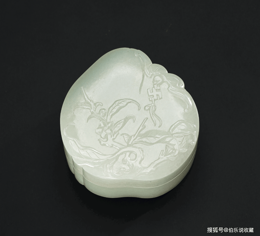 此盒以和田白玉雕琢而成,通体葆光滢滢,整器摹桃实造型,造型圆中带尖,宛若一个半剖的桃实,不中绳墨规矩而愈显栩栩如生,上下起口相衔,咬合紧密,掏膛匀净,器壁甚薄,内壁打磨光洁细致,颇具工艺难度。盒盖上雕镂枝蔓,玉叶环绕,缠绕缱绻,如初落蒂,叶片舒展翻卷,叶脉分明,叶尖悬垂如水滴,巧妙雕出叶片之阴阳向背,飘逸灵动。空中浅浮雕一灵蝠,圆眼尖喙,振翅而飞,口衔万字纹钩蝴蝶结,寓意万事如意,甚是精彩生动。