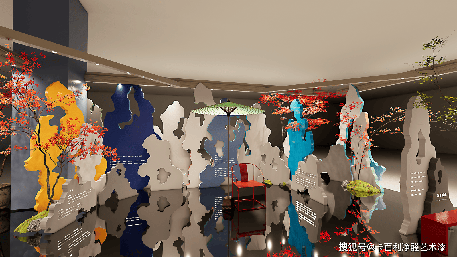 本次展厅由卡百利艺术漆、广州设计周推广大使余飞扬老师、空间设计师/南京藝界国际设计王虎成老师联合策展。这不仅是产品的展示,更是一次艺术品级的思想呈现。展厅以“非遗国色”为魂,将深邃的东方色彩智慧与极简的现代设计语言相融合,构筑一个可观、可感、可思的沉浸式美学空间。