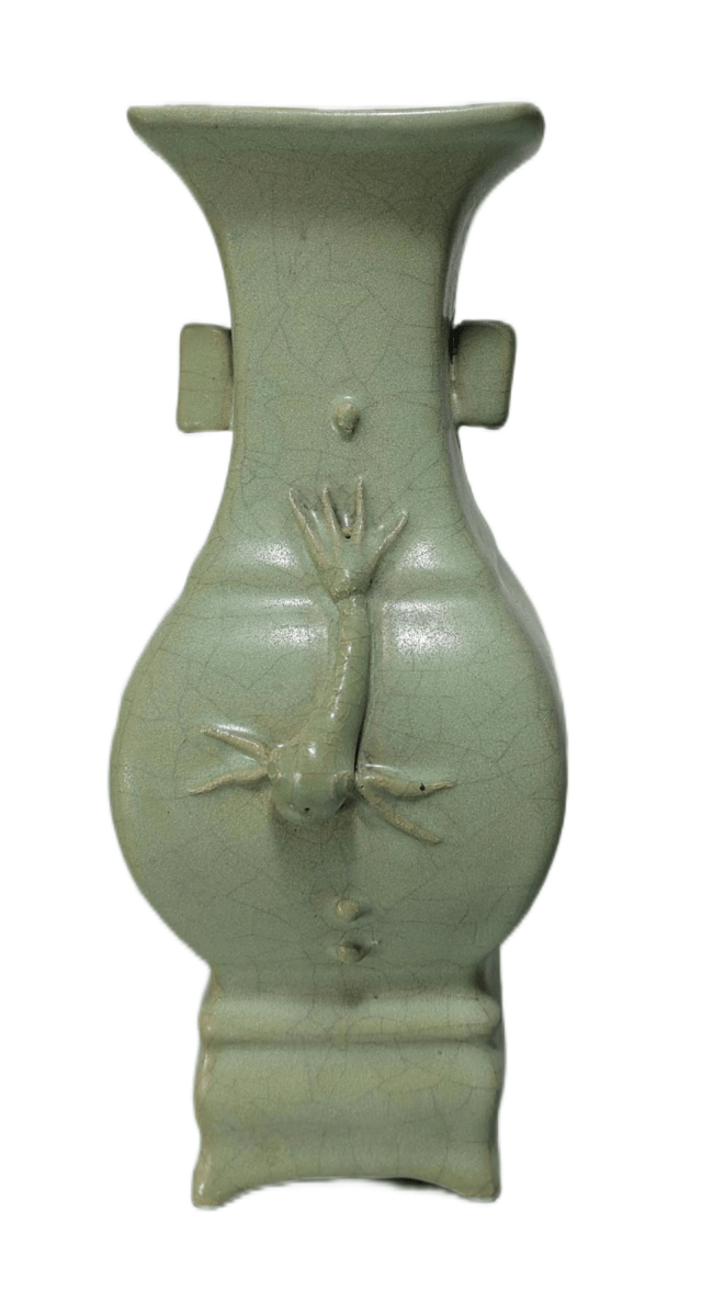 五代柴窑薄胎艾绿釉贴塑石巴子鱼矮脚四方瓶