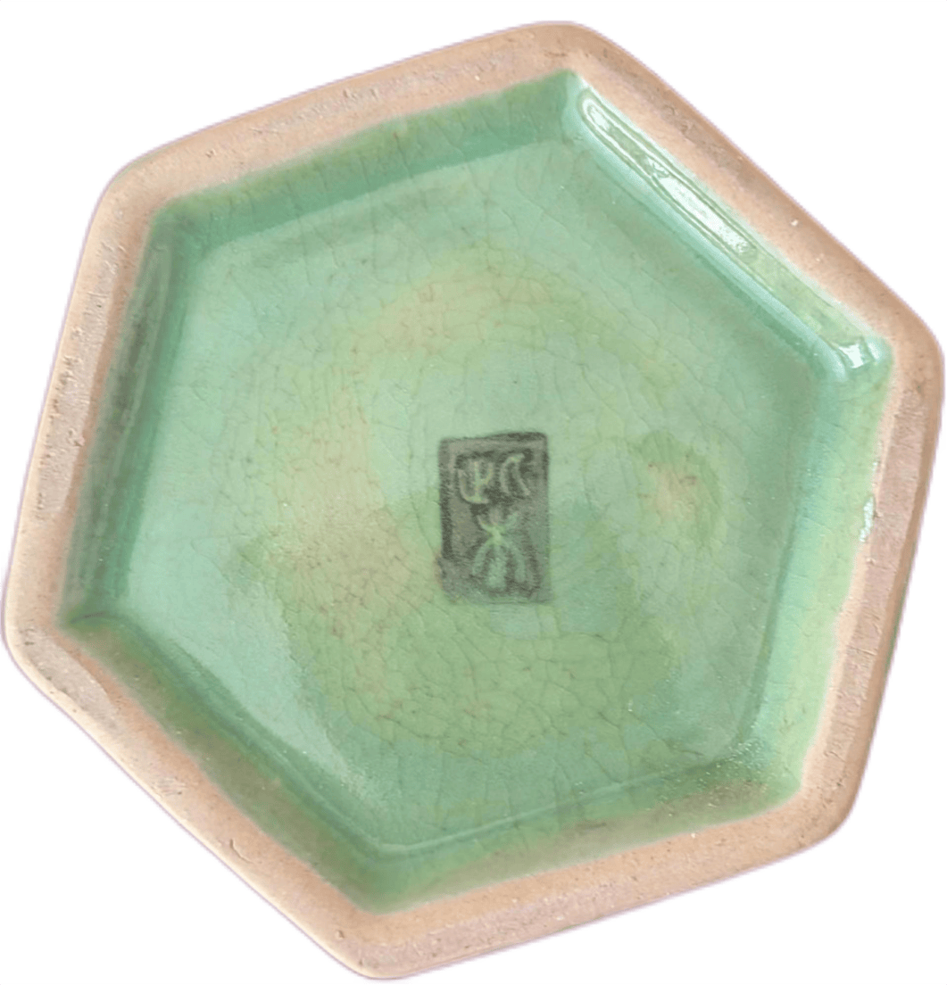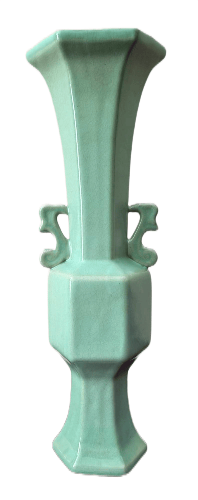 五代柴窑薄胎苹果绿色釉六棱形双耳花孤