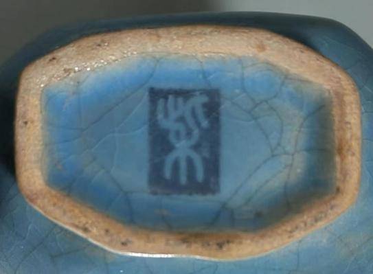 瓶高17.3㎝,口径5.4㎝,底径4.4㎝。 喇叭口,鼓颈,六棱橄榄形鼓腹,圈足,底褐色长方框内篆书“柴”字款。(量子年份检测五代晚期)