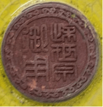 瓶高38.6㎝,口径8.86㎝,底径8.7㎝。六棱喇叭口,鼓颈下柱形两面饰对称蝴蝶耳,另两面各饰鼓钉纹三枚,下腹瓜棱形,圈足外撇。施葱绿色釉,开细碎片纹,底褐色长方框内竖行篆书“柴”字款。(量子年份检测五代晚期)