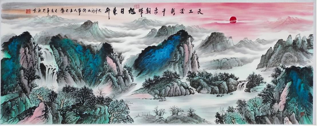 此《旭日东升》长179cm、宽70.5cm,是一幅气势恢宏的巨幅山水佳作。画面以 “旭日东升” 为主题,远处山峦在云雾中若隐若现,一轮红日跃于天际,霞光染红天际与云海,层次丰富的色彩将日出的壮丽瞬间定格。近处瀑布飞流直下,山石以青绿、墨青等色皴染,树木葱郁,笔法细腻且富有动感。整幅作品布局深远,色彩明快,既展现了传统山水画的空间意境,又通过现代色彩技法强化了视觉冲击力,将 “天行健,君子以自强不息” 的精神内涵与山水自然之美融合,是王天缘山水创作中体现雄浑气象与积极意境的典型作品。