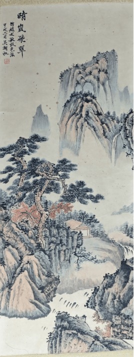 《晴岚飞翠》长102.5cm、宽39.5cm,是吴湖帆仿赵孟頫设色法的青绿山水作品。画面中山峰巍峨,松枝苍劲,山间云雾缭绕,一座小屋隐于林间,色彩以青绿为主,间杂赭石,层次丰富,尽显宋元山水的典雅韵味。笔法细腻,设色清丽,既体现了吴湖帆对传统青绿山水技法的精湛掌握,又融入了个人的文人审美,是其山水创作中追摹宋元、展现典雅画风的精品,具有浓厚的传统山水艺术价值。